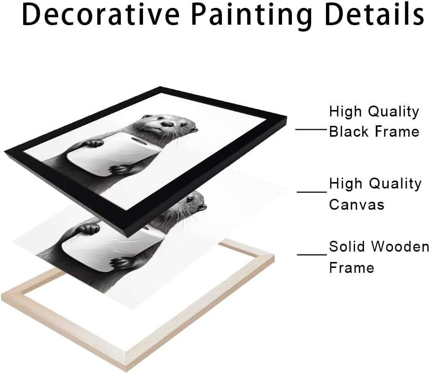 Bathroom Picture Wall Decor, Framed Black and White Bathroom Wall Art, Toilet Paper in Little Funny Raccoon's Hand Animal Canvas Print Painting