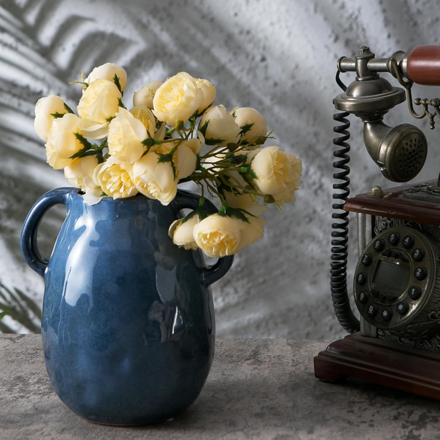 Blue Ceramic Vase with 2 Handles - Modern Farmhouse Rustic Terracotta Decorative Clay Boho Vase for Pampas Grass and Home Decor